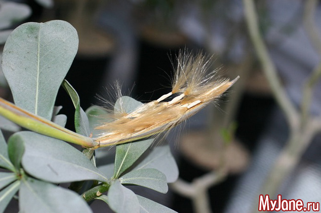 По утверждению многих цветоводов адениумы автостерильны, т.е. у них возможно только перекрестное опыление (хотя на форумах описываются и случаи самоопыления). Из-за довольно сложного строения цветка, в природе эти растения опыляются всего несколькими видами насекомых, которых у нас, естественно, нет, так что данную роль приходится играть самим хозяевам цветка. Если процесс прошел удачно, на месте бывшего цветка образуется плод-стручок с мелкими и очень летучими семенами.