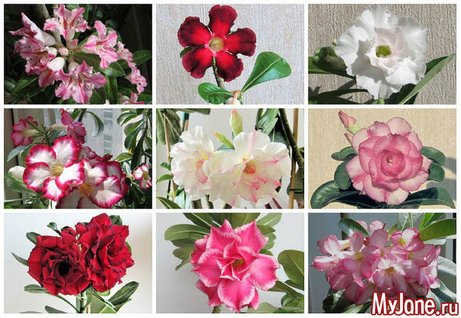 Декоративные комнатные адениумы обычно не вырастают в высоту более чем на 1,5 м. Цветы у различных сортов адениумов, которых в настоящее время насчитывается уже несколько сотен, могут быть как простыми, так и махровыми: