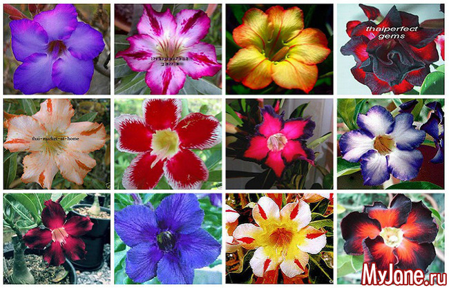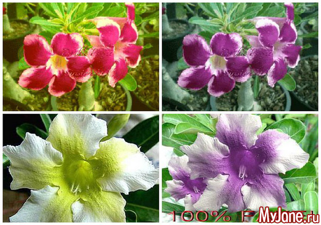 Однако адениумов с окраской венчика голубого, синего, фиолетового, малинового, черного и оранжевого цвета и вариантов их сочетания с другими цветами в природе не существует. На приведенном ниже коллаже хорошо видно, как легко «выводятся» новые сорта адениумов при помощи фотошопа: